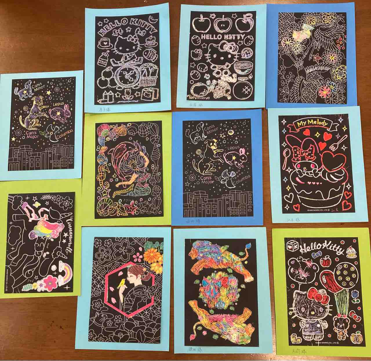 スクラッチアートとは紙全体に色々な色を塗り、その上から黒の色で覆った髪をペンで削って作品を作るという物です。